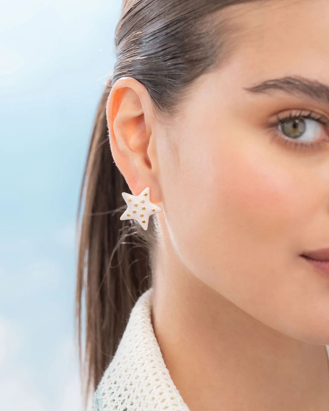 Aretes tipo topo con diseño de estrella, elaborados con aleación de metales y baño de oro de 24k, finalizados con laca de alta resistencia, hechos en Medellín y pintados a mano en color nude. Su tamaño de 22 mm los hace ideales para el uso diario o para combinar con otros accesorios. Cierre tipo mariposa con silicona de alta resistencia que proporciona un ajuste seguro y cómodo.